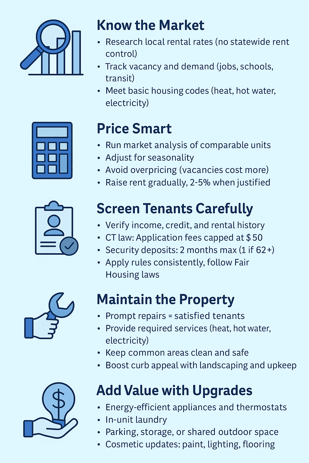 - Regular Rent Reviews: Each year (or between tenants), revisit your rental rate. Connecticut does not limit rent increases by law, but sudden huge hikes can prompt tenant turnover or complaints. A best practice is to implement modest, fair increases that keep up with inflation and local rent trends. For example, a 2–5% yearly increase (if justified by the market and property improvements) can boost your income while seeming reasonable to tenants. Always provide proper notice of any increase as required by your lease and state law (typically at least 30 days for month-to-month tenants). If your town has a Fair Rent Commission, ensure your increases would be considered fair in case they are reviewed.